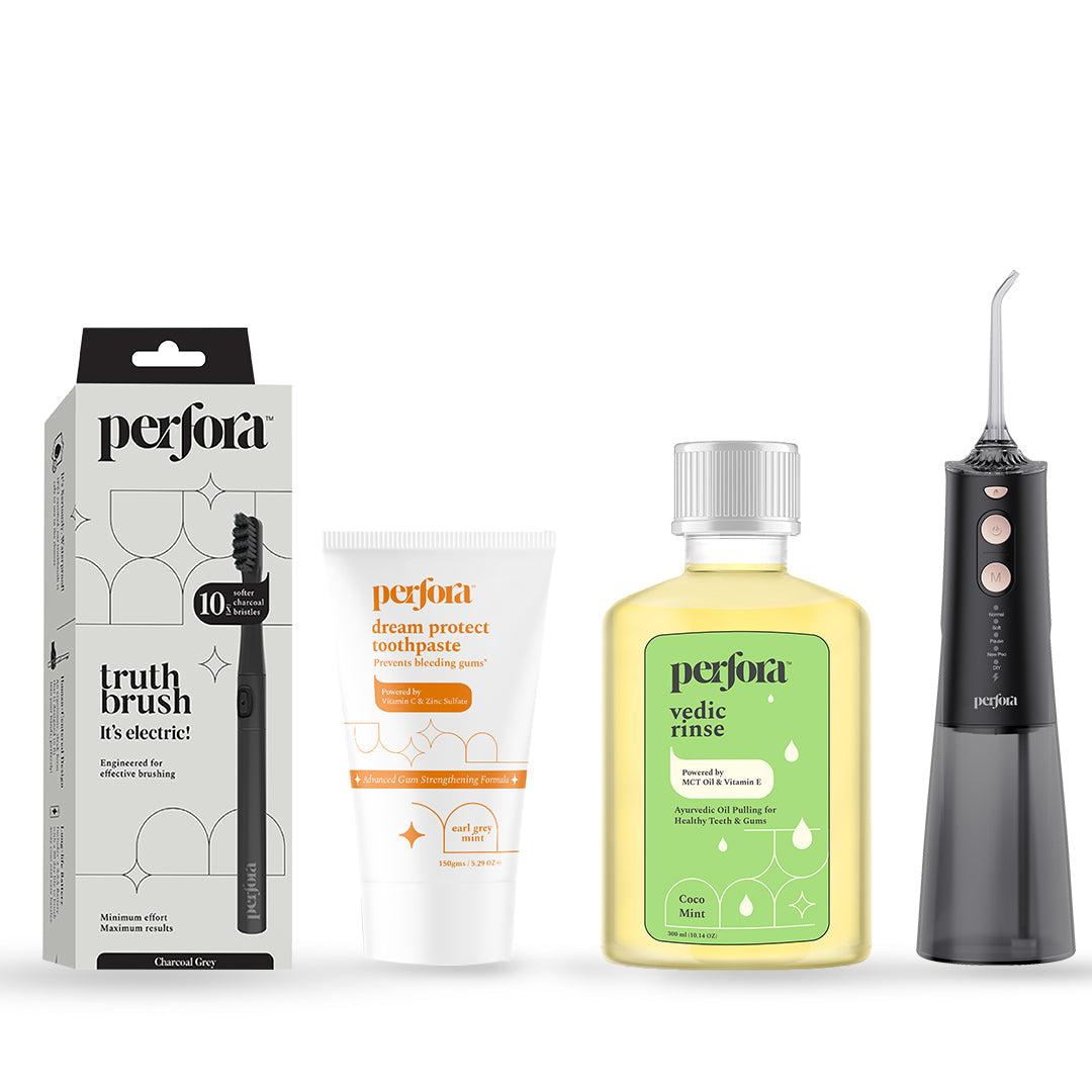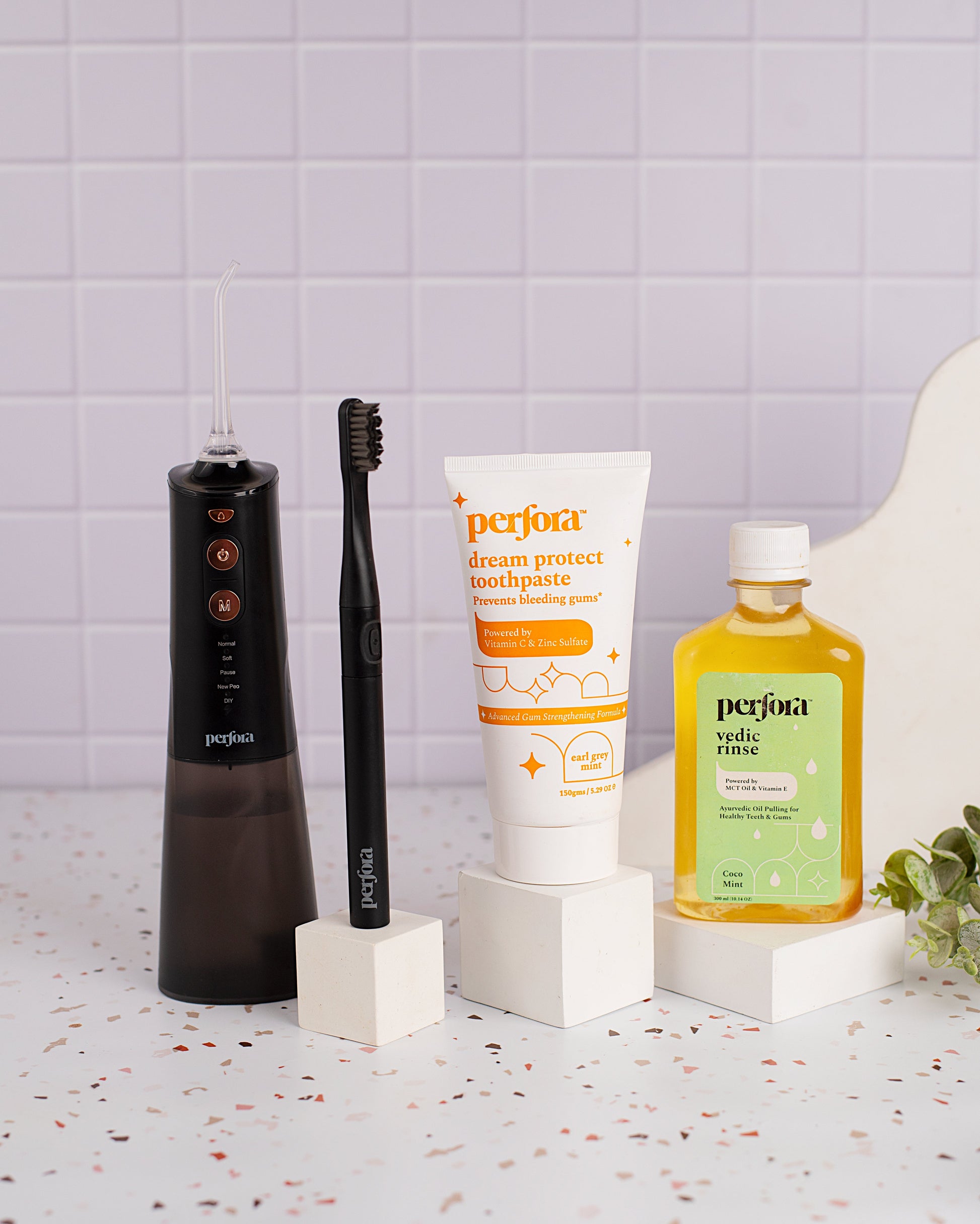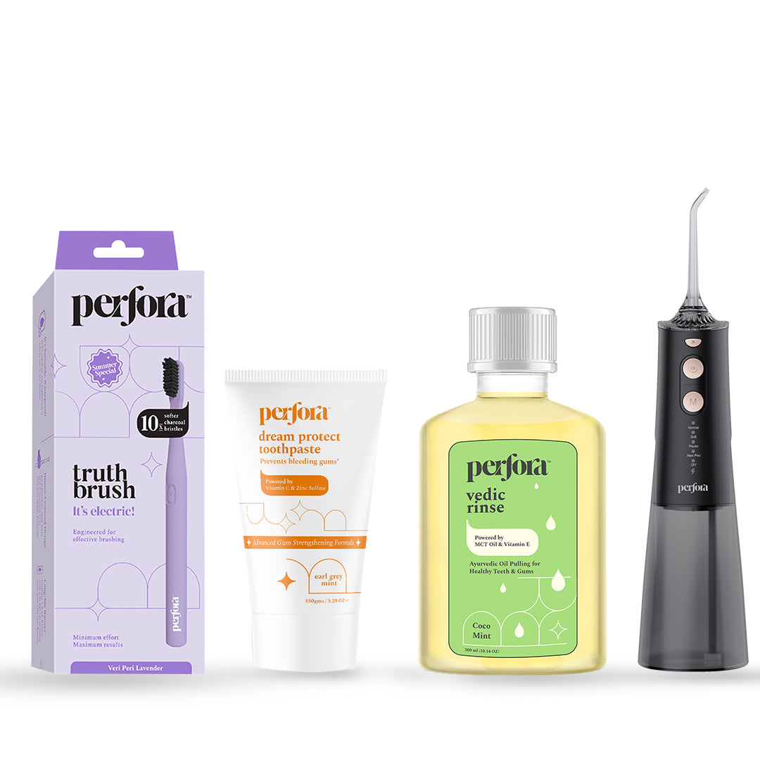 - Contains sonic technology electric toothbrush, Nano Hydroxyapatite fortified Gum Protection Toothpaste, Vedic Rinse - Oil Pulling and Smart Dental Flosser